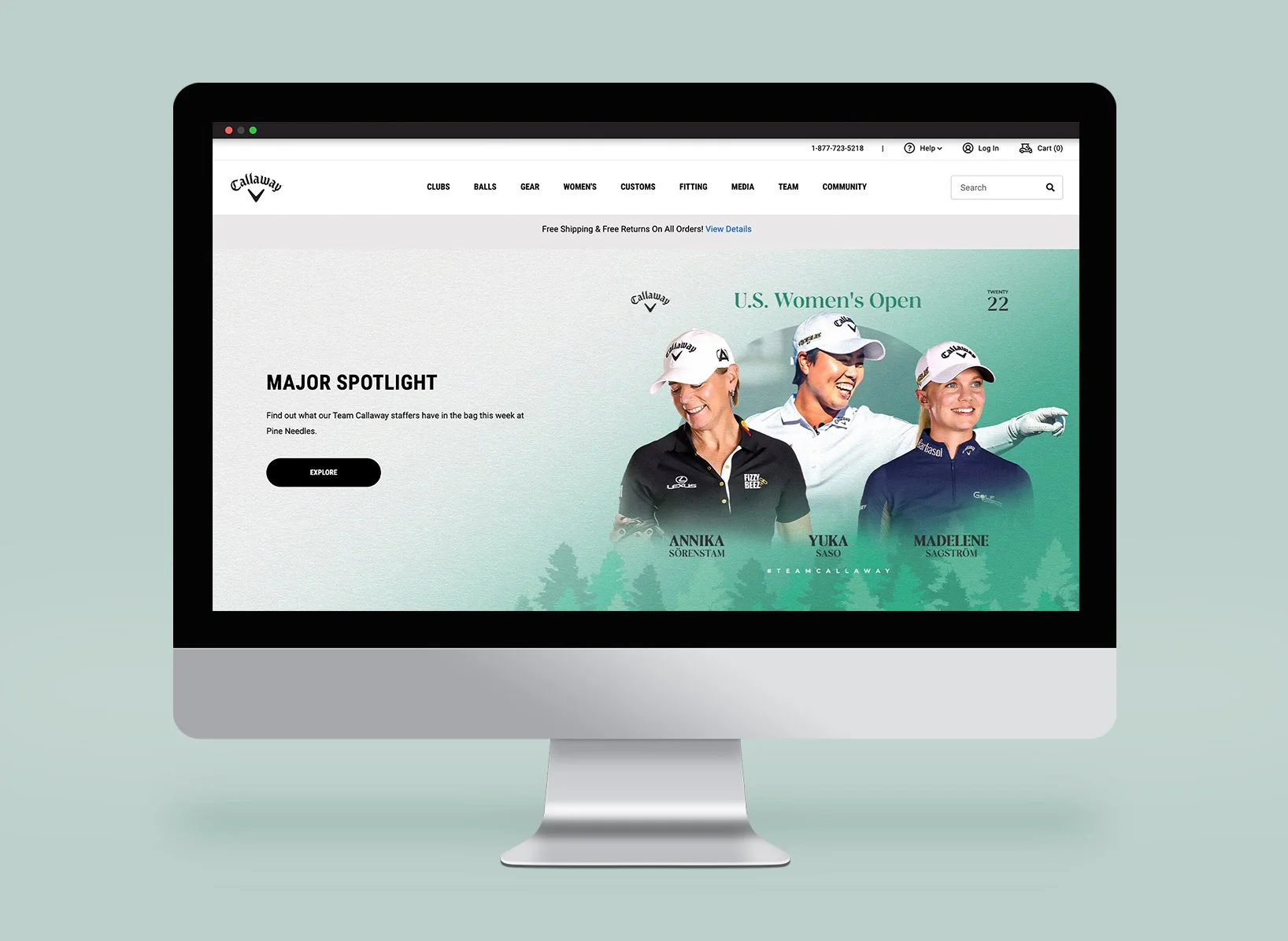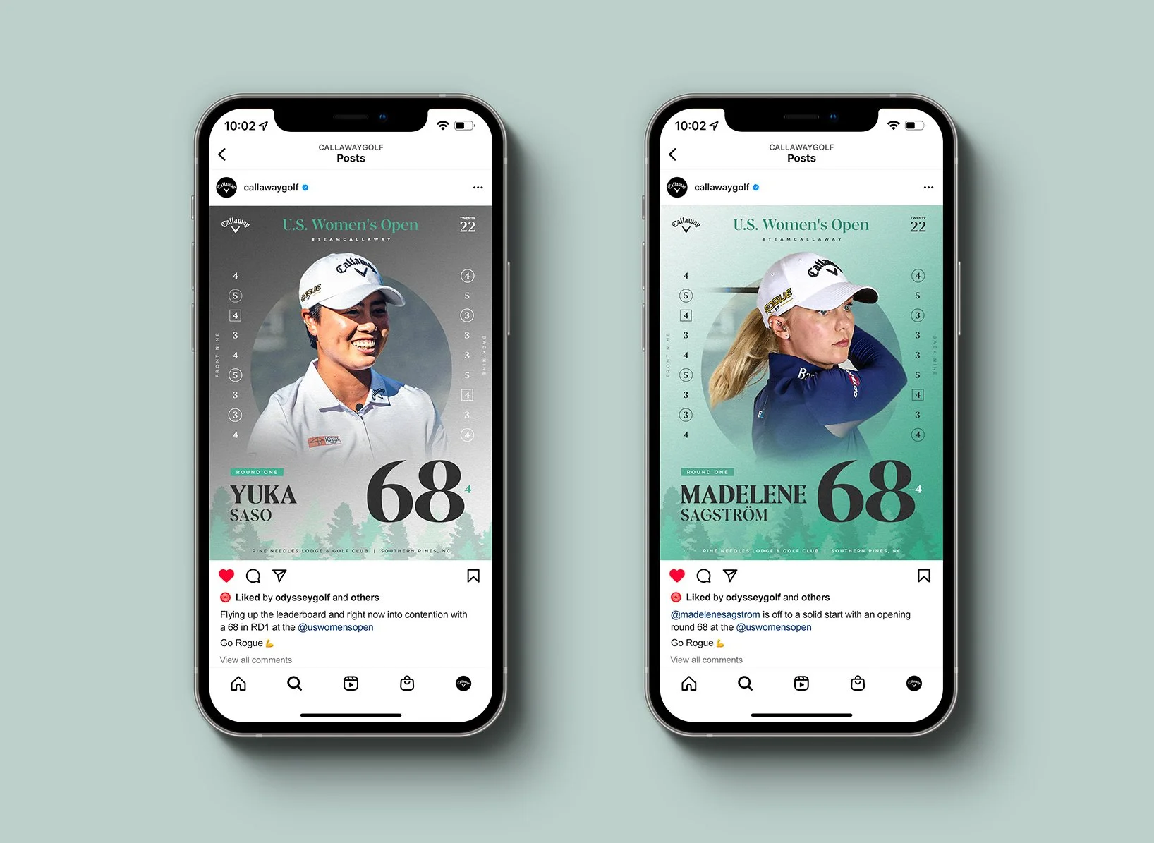 Team Callaway social and web assets for U.S. Women’s Open. Design style was inspired by tournament golf bag with light & dark mode differing for week and weekend leaderboard updates.